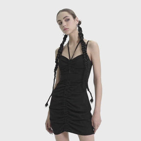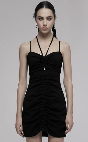 Worship yer curves in the Velika Bodycon Dress! Soft stretch fabric hugs yer bod, forming a ruched effect that creates a flattering centre line and a small cutout at the chest. The drawstring can be tied at the neck as a halter or alongside the shoulder straps.