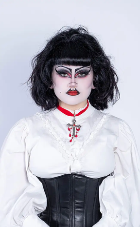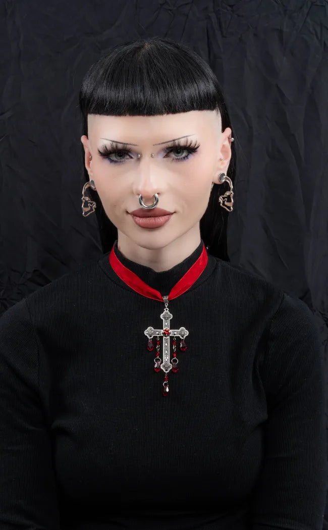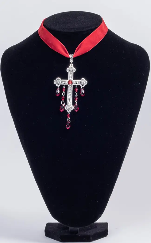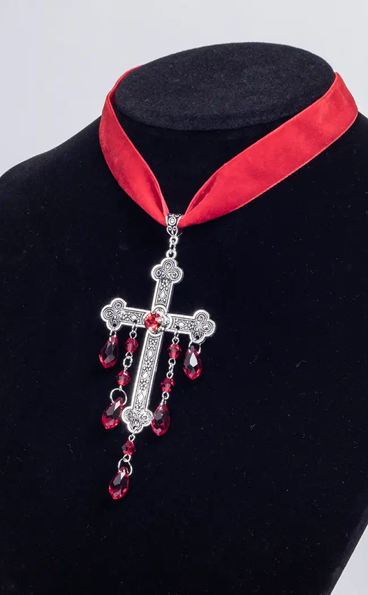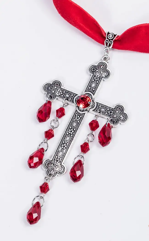 Introducing our ultra-soft velvet chokers! It is adorned with a stunningly ornate cross, boasting red jewels one embedded in the centre and the rest left dangling. This choker looks great on its own or layered with other necklaces and is the perfect way to elevate any outfit!