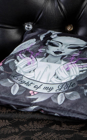 Reanimate your spooky decor with the Light Of My Life Cushion cover! This cover features gorgeous artwork of the Bride of Frankenstein. Perfect for any lover's bedroom or couch!