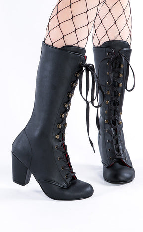 Step out in vintage style in the VIVIKA-205 boots! These cute mid-calf lace-up boots feature a classic Victorian shape that secures with ribbon lace-ups and a rear zip. Perfect with anything from ballgowns to skinny jeans.