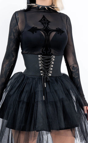 This versatile corset will become yer new fave accessory, formed from stretchy fabric into a waspie shape that secures with a lace-up front.