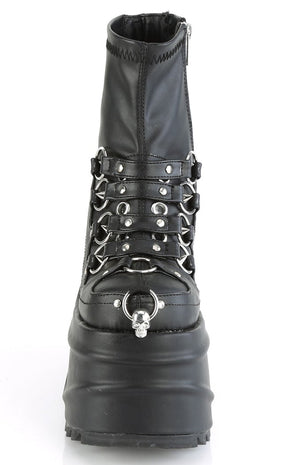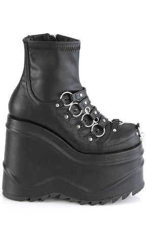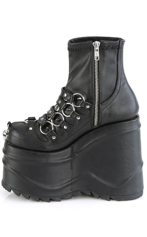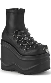 Make waves baby! The WAVE-110 ankle boots feature a killer platform wedge, plenty of O rings with straps and a comfy stretch PU upper.