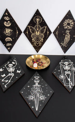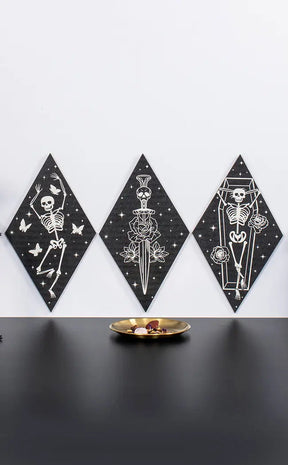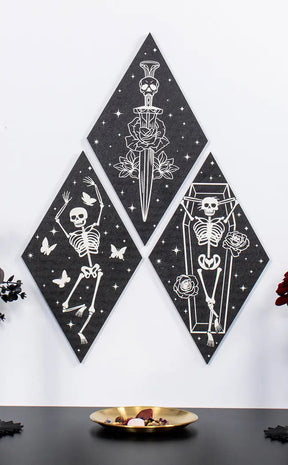 This trio of wall art features a dancing skeleton, a coffin skeleton, and a skeleton sword - the perfect addition to any spooky-savvy home. Spice up your walls with a touch of deathly delight.
