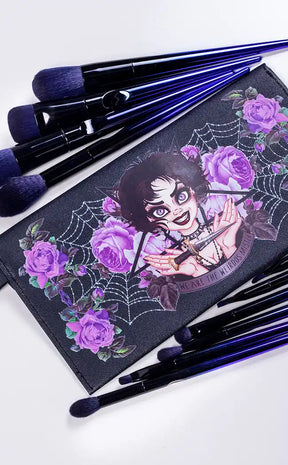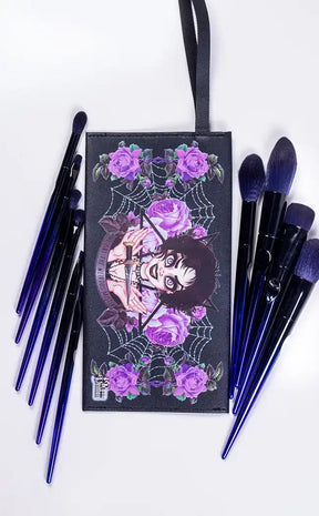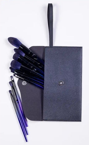 Each brush has a stunning deep purple metallic finish with purple bristles. They come in a handy vegan leather pouch with art by Australian artist Rose Demon of Nancy from The Craft. This set even has a loop to carry over your wrist so you won't lose these bad boys on the go.