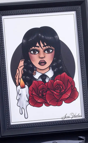 This beautiful artwork was done by Jessie Vorhees in her distinctive style. This unique portrait of Wednesday Addams with a candle and roses will add a bit of goth glam to your room.