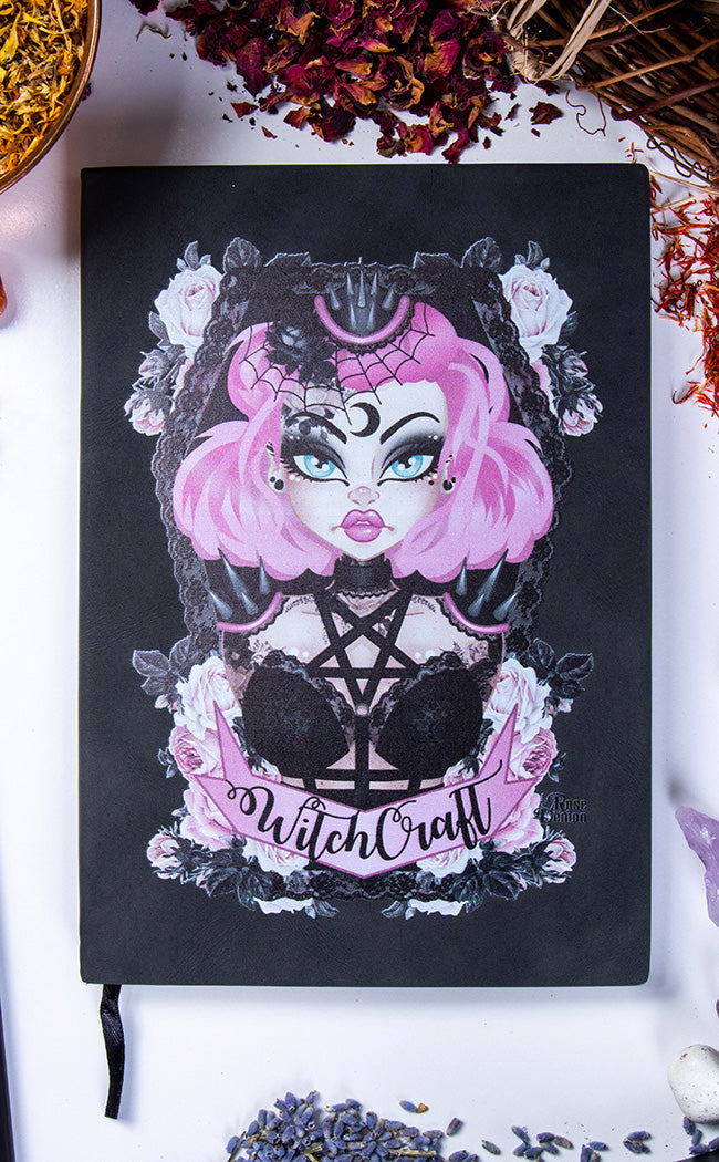 Turn yer diary into a grimoire with the Witchcraft Notebook! This soft-cover notebook features statement artwork of a pastel goth witch surrounded by roses and a banner stating "Witchcraft". The pages are lined and the book comes with a ribbon bookmark, keeping you nice and organised.
