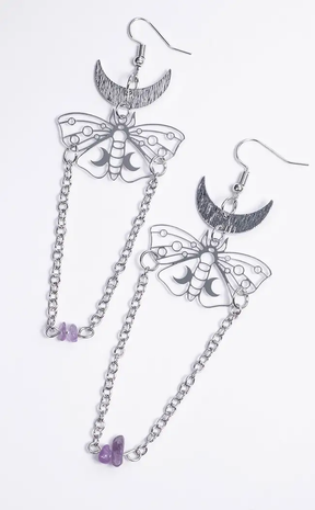These handmade dangling beauties feature a lunar moth drawn to the moon, with a small chain of two tiny purple crystals for added sparkle and lustre. These earrings are featherlight and cozy to wear all day long!