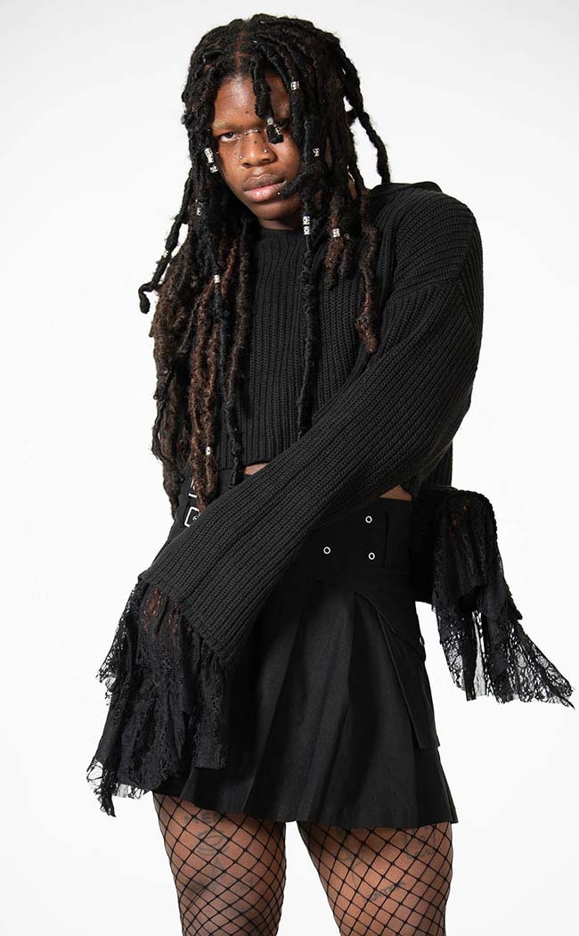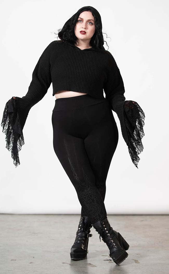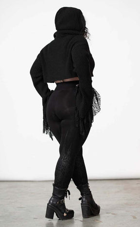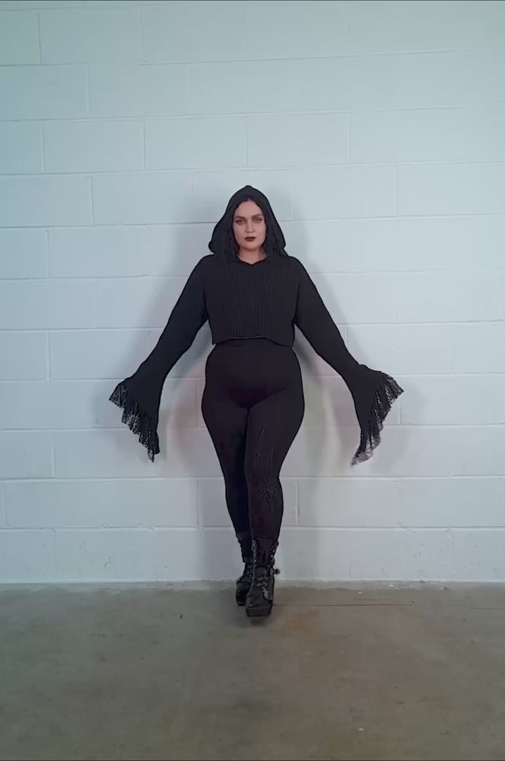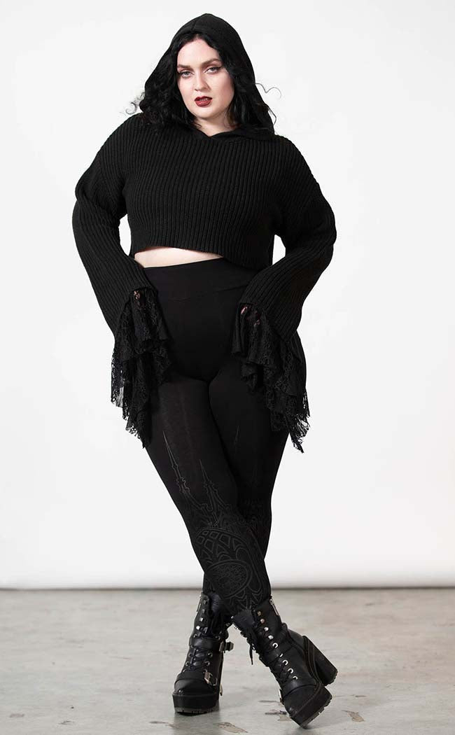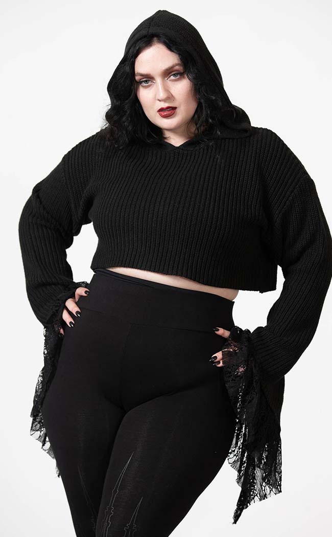 Create your own future in the Witch Cult Knit Sweater. Soft, stretch knit forms this fitted, cropped sweater, featuring dramatic sleeves with lace inserts and a large, spooky hood.