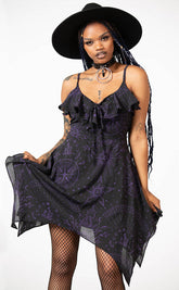 Cast a spell in the Witches Finger Chiffon Dress! Soft, lightly stretchy black mesh printed with a custom celestial print to have ya feeling like a lunar goddess. This flows over an opaque slip, forming a ruffled lace-up neckline, adjustable shoulder straps and a hanky hem.