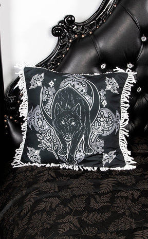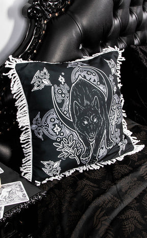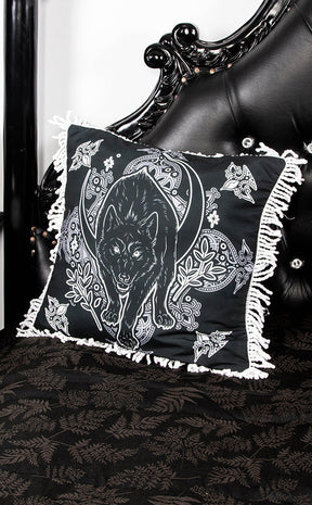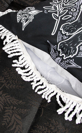 Howl at the moon while curled up with the Wolfsbane Cushion Cover! Made with soft, smooth fabric, this decorative cushion features stunning artwork of a wolf in a black on black print surrounded by a tassel trim.