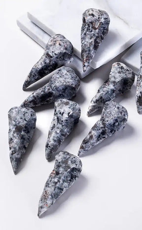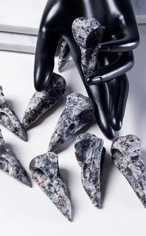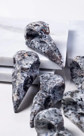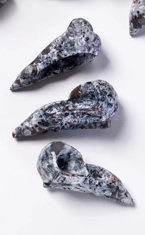 These crow skulls have been carved out of Yooperlite and are beautifully detailed representations. If you have a blue light you can see the fluorescent bits of sodalite glow! Each crow is about 50mm long and weighs approx. 20-25gms.
