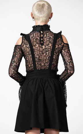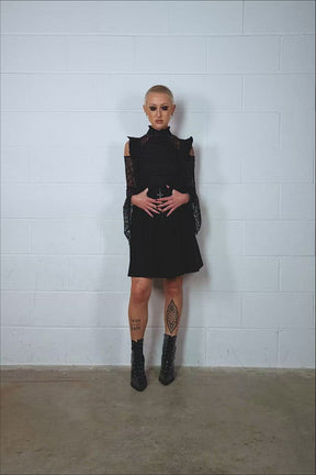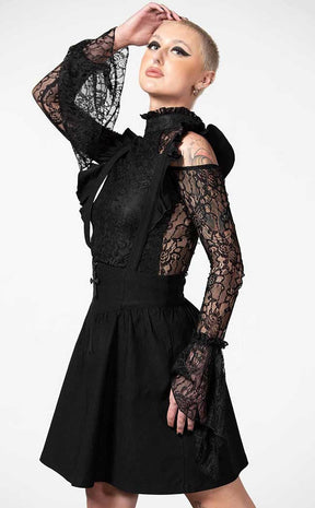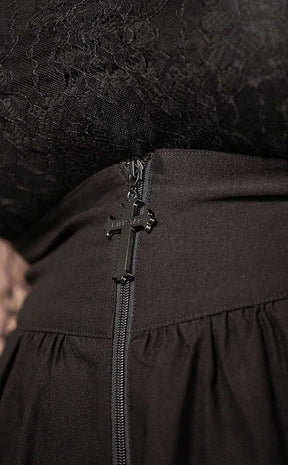 Dress to distress in the Yuna Suspender Skirt! This cute n evil statement piece features a wide, high waistband to hold its skater skirt which secures with a cross charm zip. The ruffled suspender straps are the perfect companion for your fave crops, tees n blouses.