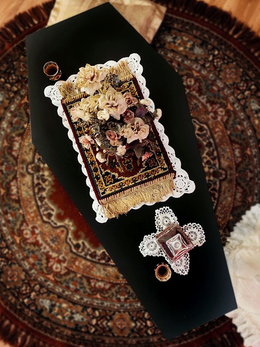 Create a breathtaking setup with a decadent tea party platter on our Ophelia, accompanied with fresh flowers from your garden in our brand-new versatile AF Lamentation Coffin Holder.