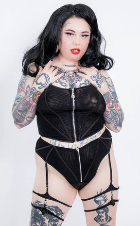 Made from luxe double layer sheer mesh with faux leather seam details. This bustier has a pointed sexy shape and a scorpion charm in front. Zips up in front.