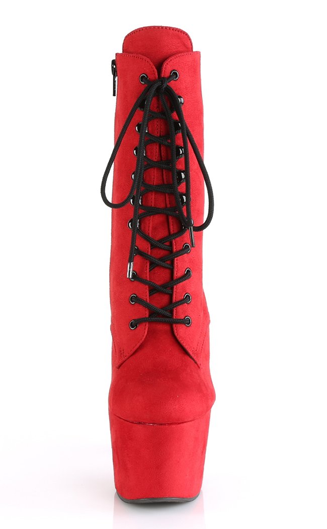 7" (178mm) heel, 2 3/4" (70mm) platform lace-up front ankle boot featuring fully wrapped platform bottom, inside zip closure