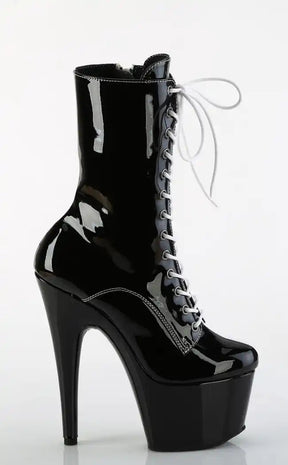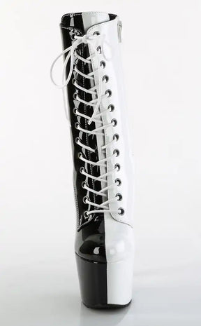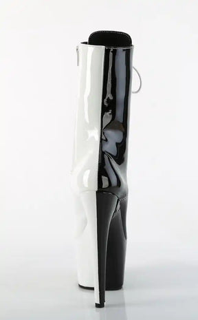 7" (178mm) heel, 2 3/4" (70mm) platform two tone lace-up front ankle boot featuring fully wrapped platform bottom and inner side zip closure.