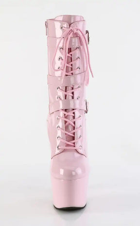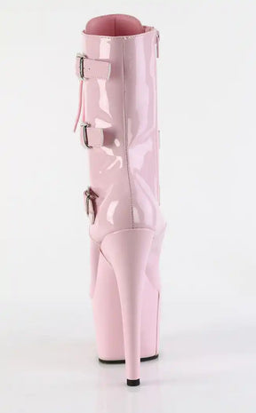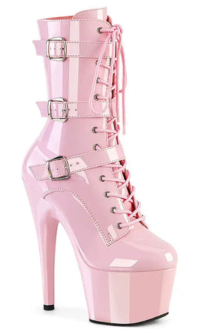 7" (178mm) heel, 2 3/4" (70mm) platform lace-up front ankle boot featuring triple buckle straps, fully wrapped platform bottom and inner side zip closure.