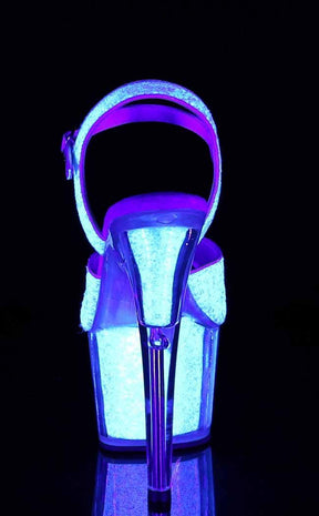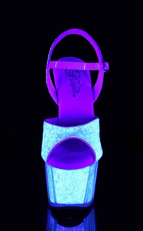7" Heel, 2 3/4" platform heel with neon opal glitter that glows under blacklight.
