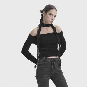 Give 'em the cold shoulder in the Adrienne Sweater! This slim-fitting sweater features long sleeves and a cutout panel to create a flattering cold shoulder. The statement collar features a removable cross charm, making this a versatile styling piece.