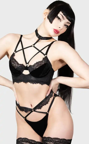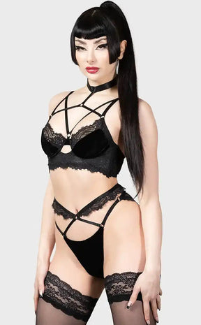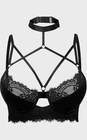 Turn into a demon dominatrix in the Killstar Affinity Bondage Bra. Conjured using a luxe stretch lace with velvet panels which stretches to perfection for a seductive and comfortable fit. Complete with accent straps this piece will make them beg.