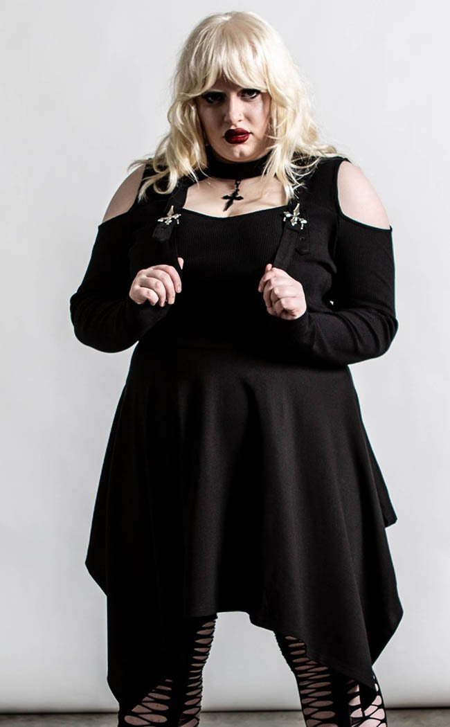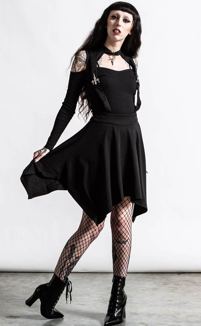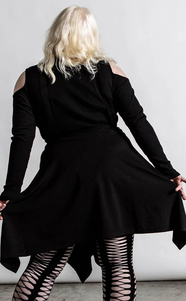Strap in, kids! The Aggie Suspender Skirt kicks ass with two thick, statement suspender straps crowned with cross decals. The skirt is super stretchy to hug n' flatter every bod, ending in a hanky hem perfect for spinning n kicking around in.