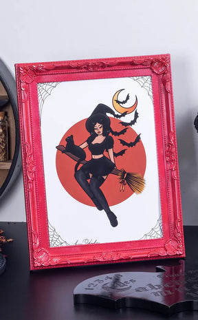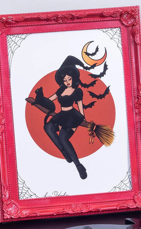 This beautiful artwork was done by Jessie Voorhees in her distinctive style. This print features a stunning witchy babe flying high on her broom with her familiar along for the ride.