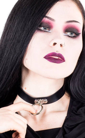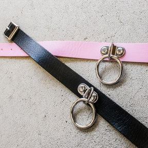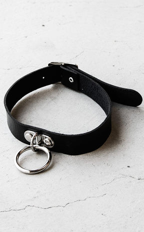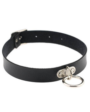 Classic black. BDSM style black faux leather choker with single ring and belt buckle closure at back.