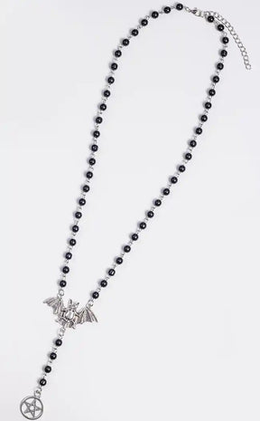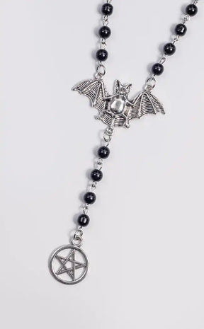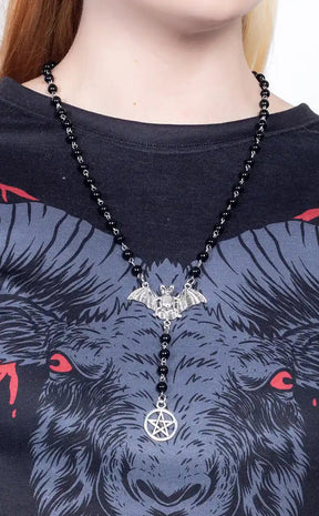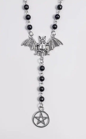 Knock them dead with this Akasha Pentagram Rosary Necklace. This necklace is in the shape of a beaded rosary with a large bat front and centre. A pentagram pendant hangs from the beaded chain.