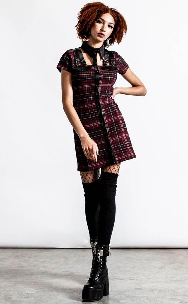 The All Attitude dress is one heck of a showstopper with its dramatic cutout neckline and statement PU collar. Buckles snake over the shoulders and meet the faux pocket details. The dress has a full button-down front for edgy military vibes.