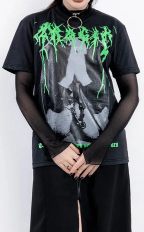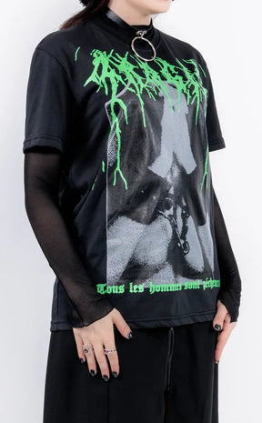 Slip into something wicked with the All Men are Sinners Oversized Tee. This tee features a set of praying hands in cuffs and the text "tous les hommes sont pécheurs" (all men are sinners).