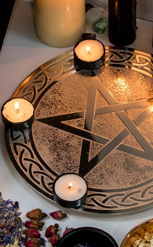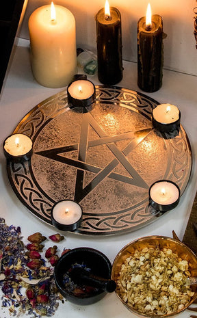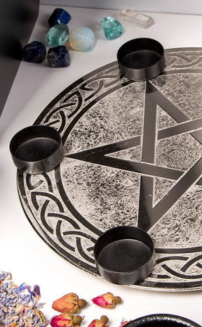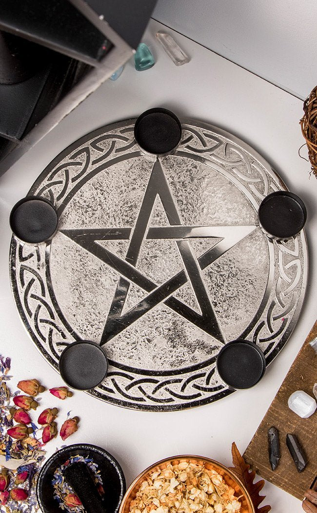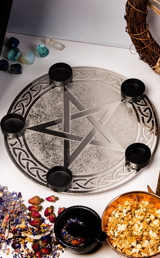 Bring soft light to your sacred space. This centrepiece is embossed with a pentagram bordered by Celtic knotwork, comprised of shining silver aluminium. Each point of the star holds space for a standard tealight.
