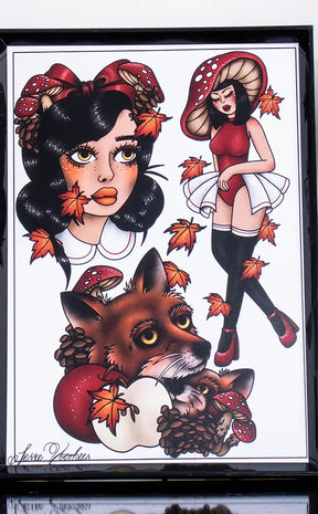 This beautiful artwork was done by Jessie Voorhees in her distinctive style. This print features tattoo flash designs of amanita mushrooms and warm autumn vibes.