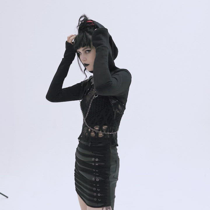 Kit up like a rebel warrior! This bolero style hood features two removable criss crossing chains that sit flatteringly over your midsection. The hood can be worn up or now depending on how much mystique you wanna exude. The front is done up with an xxxtra snake buckle to go with the rest of the heavy metal in yer outfit.