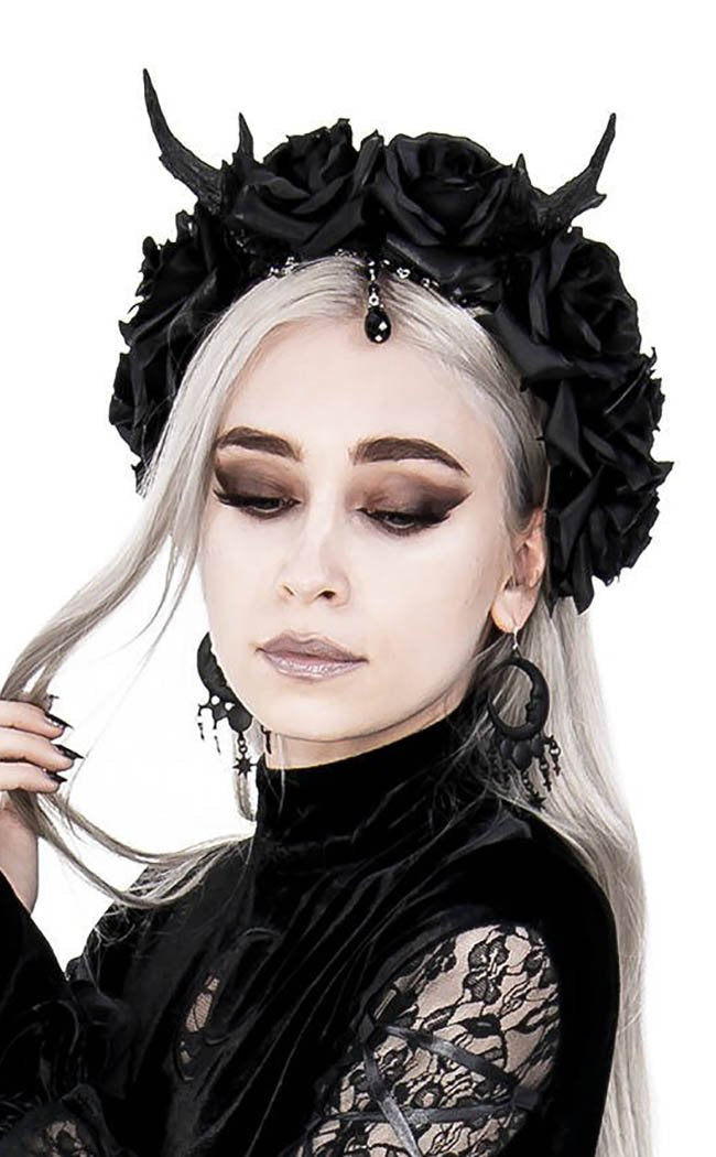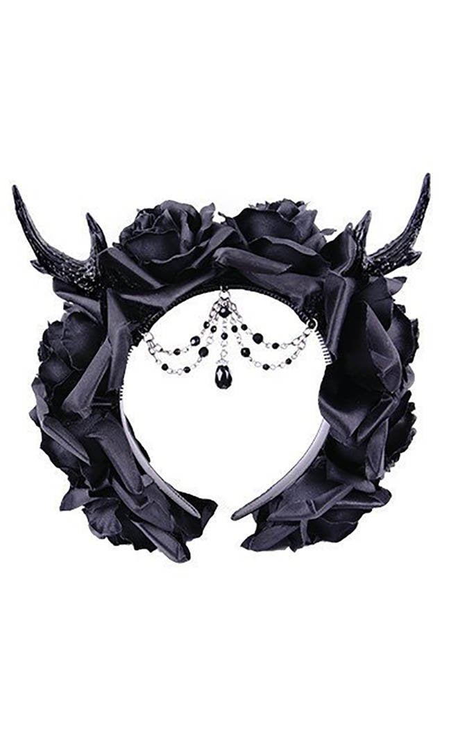 This stunning hairpiece is covered in pitch-black roses, a set of antlers secured firmly to the band with screws. Delicate chains of beads sit over the forehead like a crown.