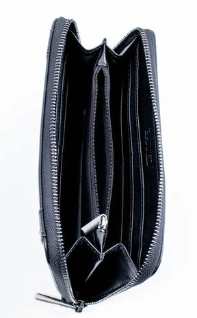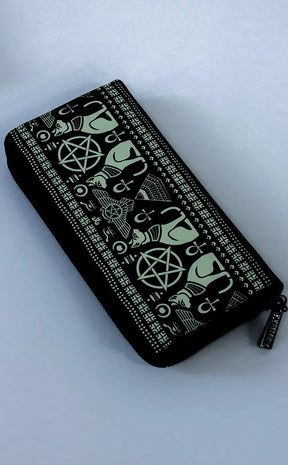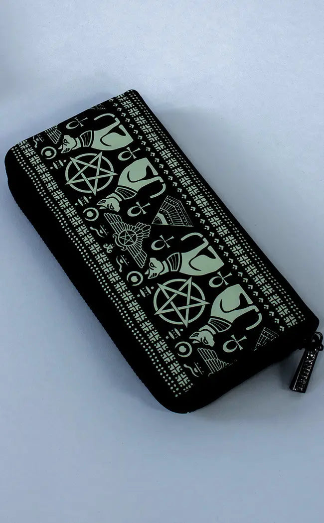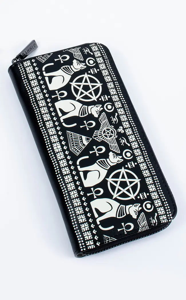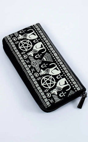 Occult black vegan leather wallet with Egyptian hieroglyphic cat print. Zip closure with coin pocket and multiple card slots.