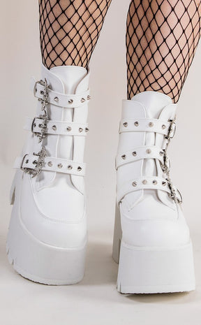 ASHES-55 White Vegan Leather Bat Buckle Platform Ankle Boots