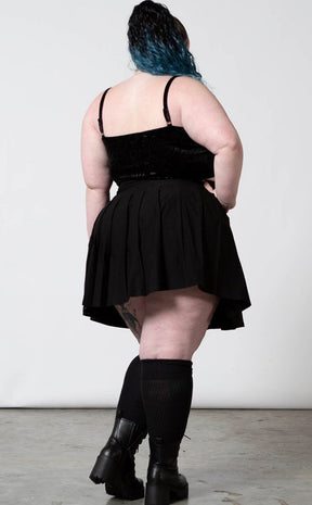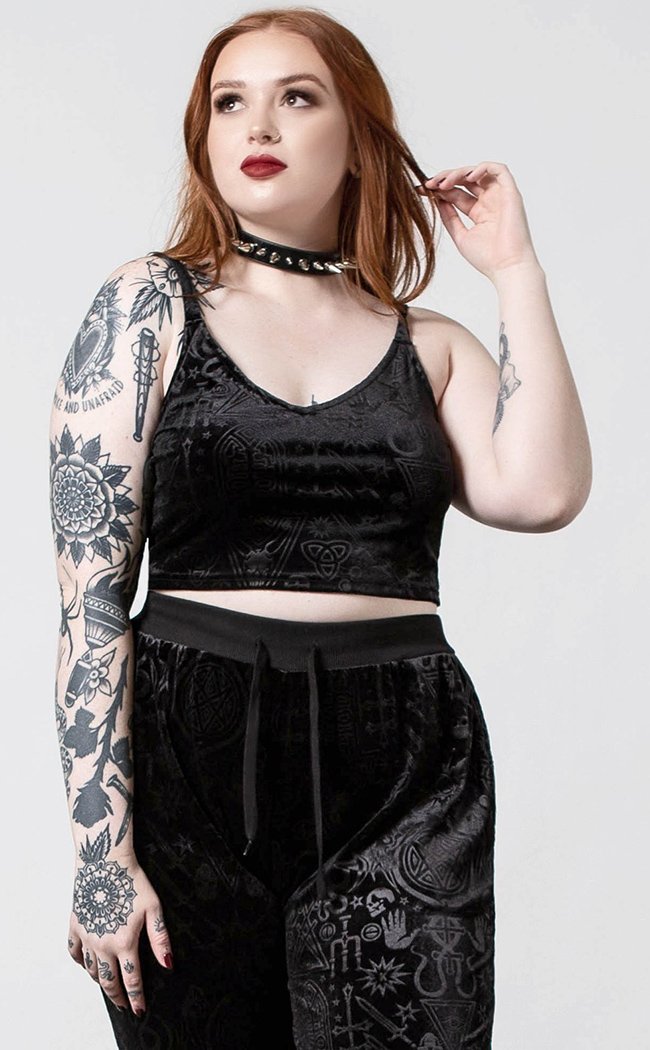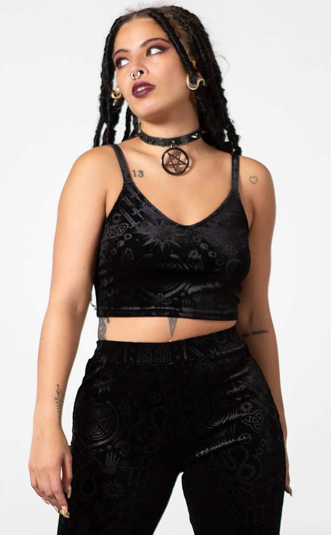 Put the dramatic cherry on top of your summer 'fits with the Ataraxia Velvet top. This fitted crop is super versatile with cami straps and embossed stretch velvet: wear it over fishnet tops or pair with shorts, pants and skirts to complete your summergoth wardrobe.