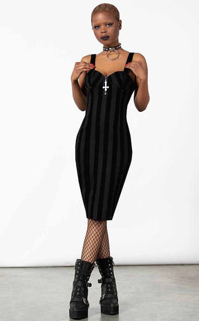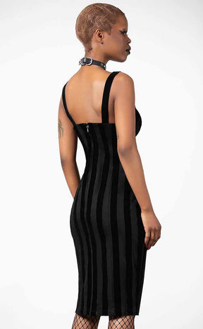 Hug yer bod in undead threads with the Back From The Dead Bodycon Dress! This statement denim dress is flocked with black-on-black stripes, forming a body-hugging midi dress with a kick pleat. The dress secures with a rear zip and features an inverted cross zip pull at the front.