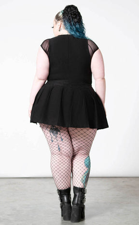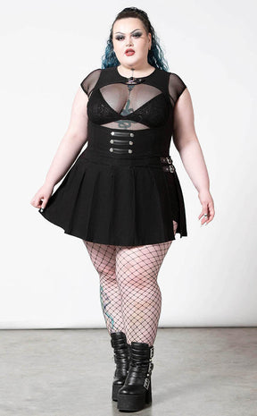 Make em' break their necks to get a look in the Bad Brigade Dress! This unique dress features a super high waist with decorative buttons and a pleated skirt with decorative buckles. The upper has a high collar with press studs and a completely open chest, perfect for wearing over mesh or contrasting shirts (or just letting the girls breathe).