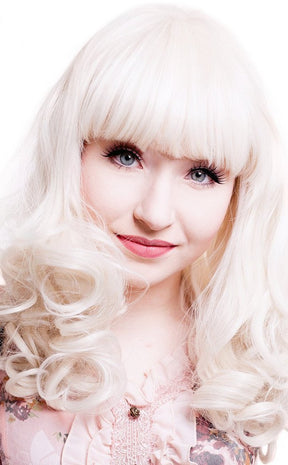 Pin Up styled gorgeous blonde wig with natural-looking curls and a classic deep blunt fringe.