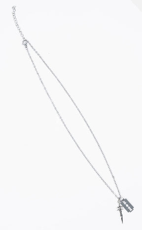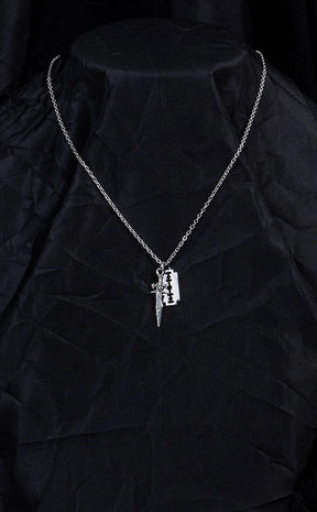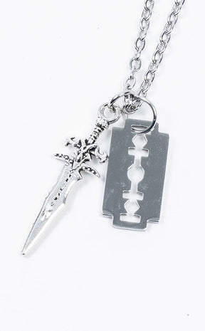 This necklace features a sharp athame or dagger with a small Baphomet intricately carved into it, paired with an intricate razor blade. A small way to bring some subtle deathly glamour to any look.