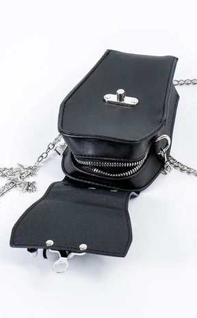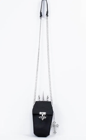 Spend eternity in style. Black as night vegan leather, three metal spikes and a bonus cross with bat charm come together in a coffin you'd be happy to be buried alive in. Use it as your daily wallet or keep it as a clutch for your haunting nights out.
