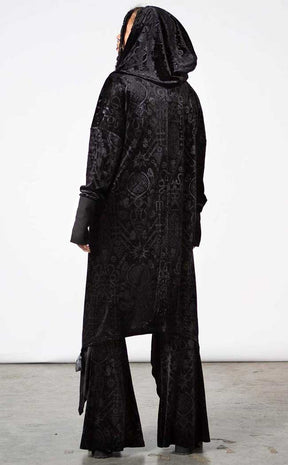 Get them admiring from afar with the Be Gone Velvet Cardigan! Super soft cardigan embossed with occult burnout patterns drapes gorgeously over yer flesh prison, forming a hanky hem and oversized hood. This cardi is the perfect layering charm, looking amazing over tops, dresses and anything you can dream of.