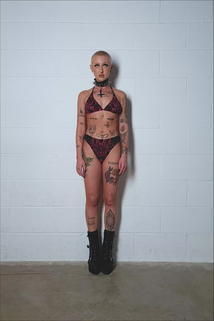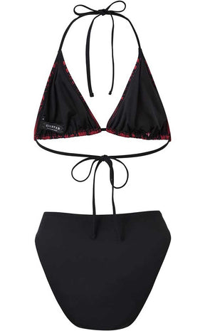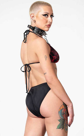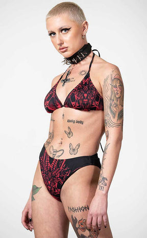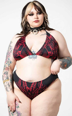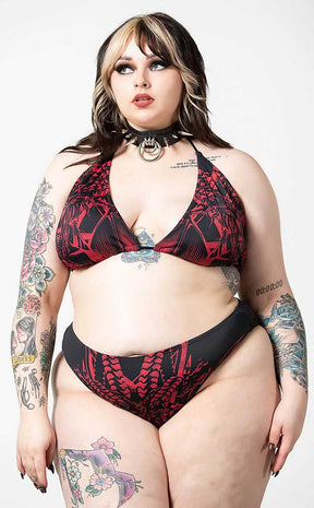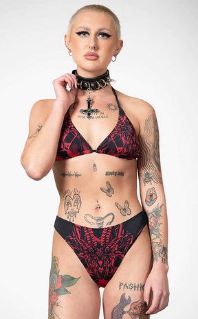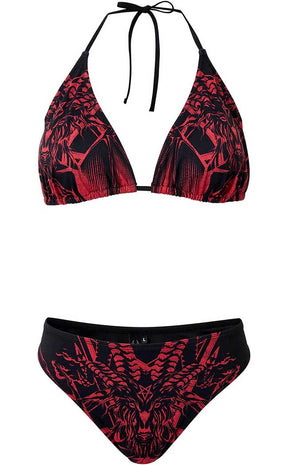 Show yer teeth at the beach in the Beast Babe 2-Piece! This gorgeous bikini features a blood-red print of Baphomet spaghetti strap closure and non-padded cups. The fabric is super stretchy and soft to last through hours of splashing and slaying under the sun.