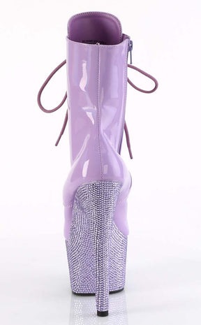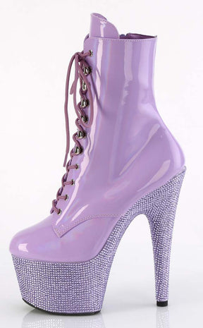 Time for a little glitter and shine! The luxurious BEJEWELLED-1020-7 boots feature a shiny lavender holo upper that secures with lace-ups and an inner zip. The platform and heel are totally encrusted in lavender rhinestones, adding xxxtra glamour to every performance!