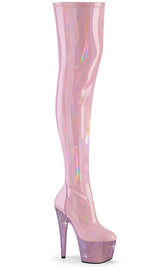 Time for a little glitter and shine! The luxurious BEJEWELLED-3000-7 thigh-high boots feature a heel and platform totally encrusted with pink rhinestones, topped with pink holo stretch faux leather. The boots secure with a half-length inner zip for easy on/off.