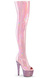 Time for a little glitter and shine! The luxurious BEJEWELLED-3011-7 peep-toe thigh-high boots feature a platform and heel totally encrusted with pink rhinestones, topped with pink stretch leather. The boots secure with a full length inner zip for easy on/off.