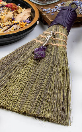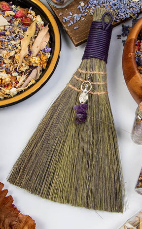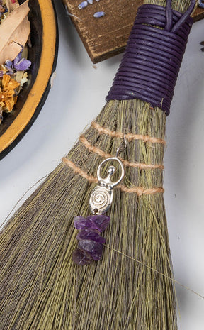 This besom is a versatile handheld broom of stiff grass, bound and decorated with an amethyst goddess charm.