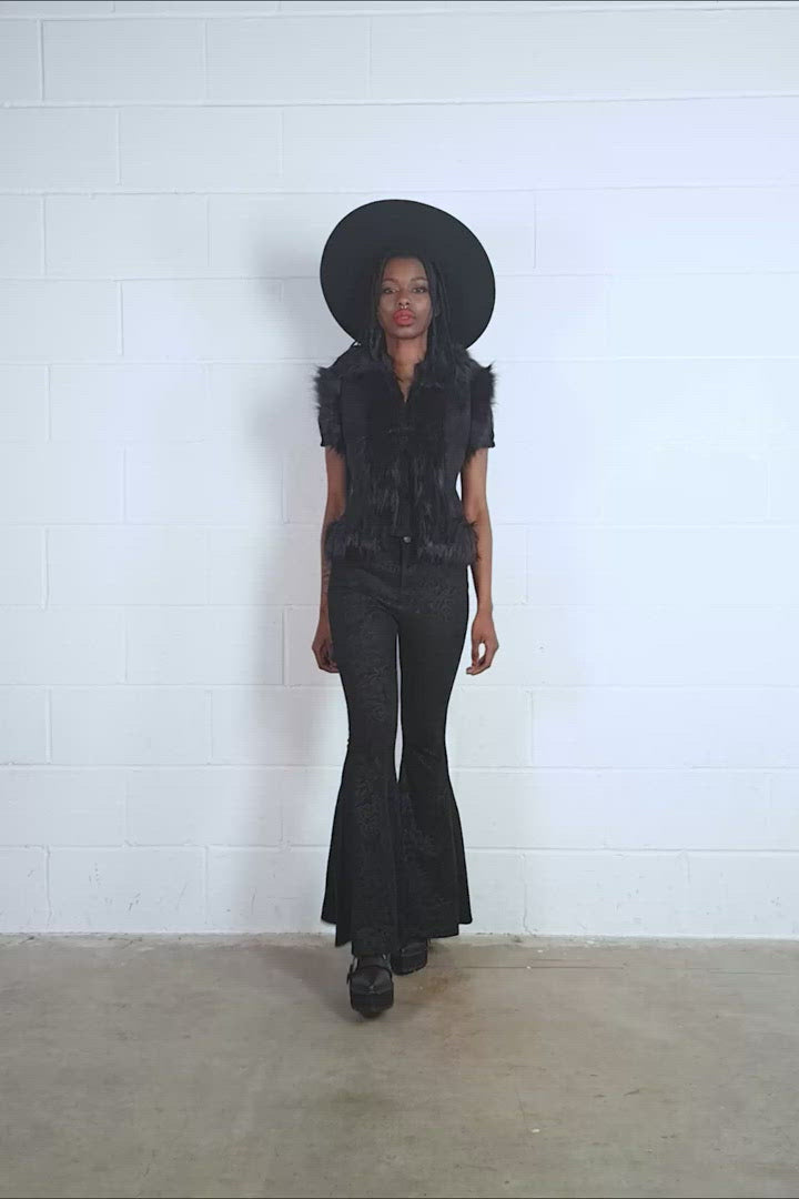 The Black Lily Bell Bottoms are the perfect companion for strolling through overgrown gardens! Light stretch faux suede forms these gorgeous flares, embossed with intricate patterns that'll have you feelin' witchy n' fancy. The pants secure with a button and zip closer and also come with belt loops and pockets