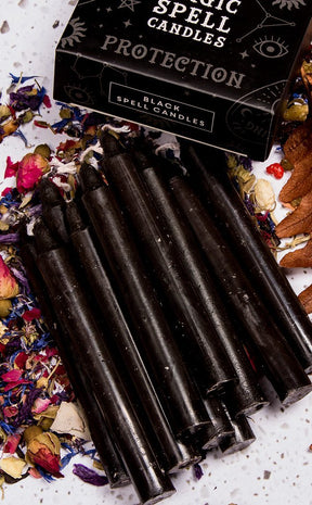 Boxed pack of 12 black spell candles for use with rituals to attract protection. Candle magic is one of the simplest forms of spell casting in which the caster decides on a goal, visualizes the end result and focuses intent or will to manifest that result.
